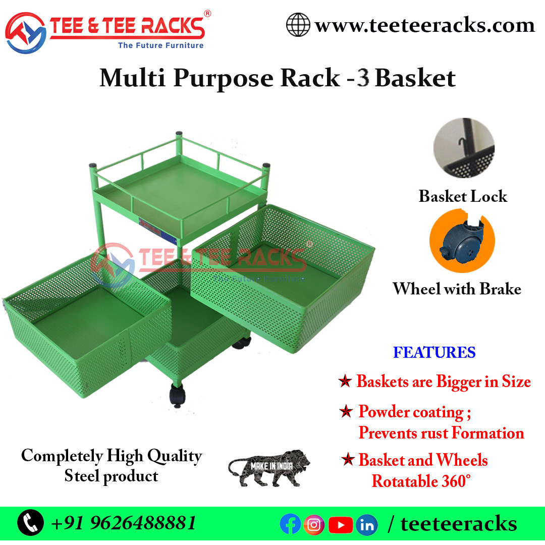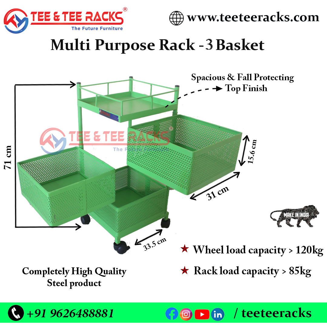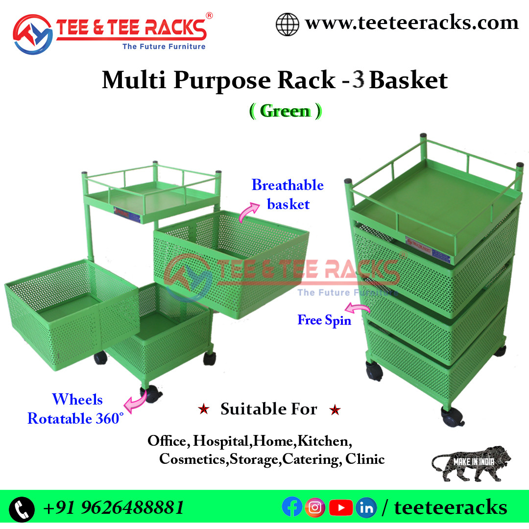 3 BASKET GREEN - TEE & TEE RACK® Multi Purpose Rotating Rack Trolley with Wheels, Portable Storage Rack for kitchen, Bathroom & Living Room, Fruits & Vegetable Container Basket Organizer Holder S