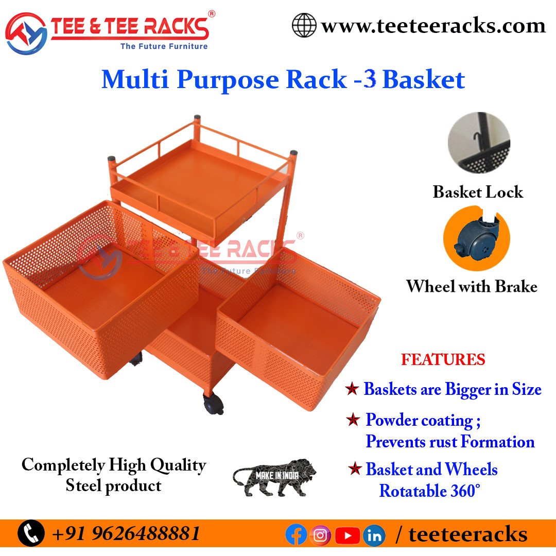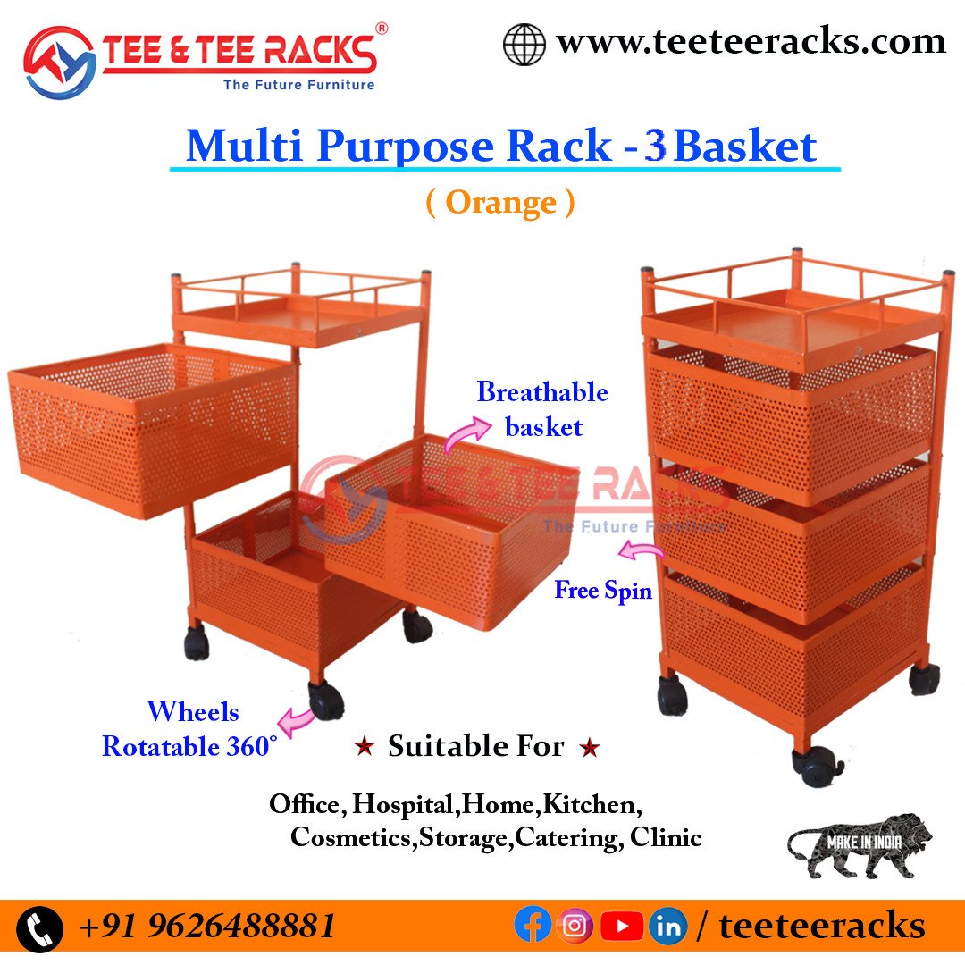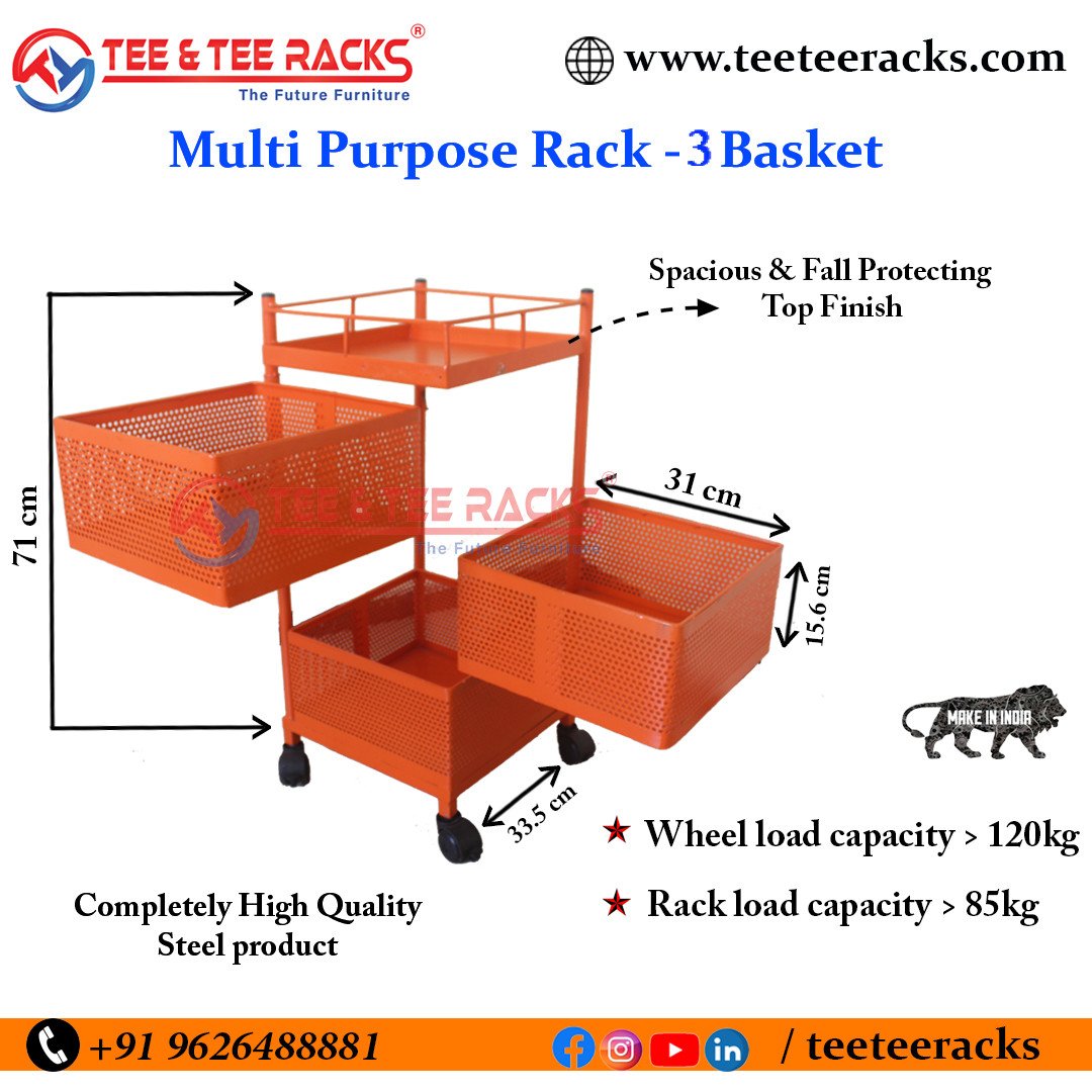 3 BASKET ORANGE - TEE & TEE RACK® Multi Purpose Rotating Rack Trolley with Wheels, Portable Storage Rack for kitchen, Bathroom & Living Room, Fruits & Vegetable Container Basket Organizer Holder S