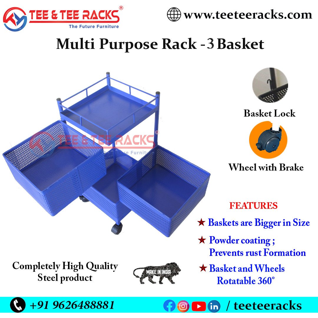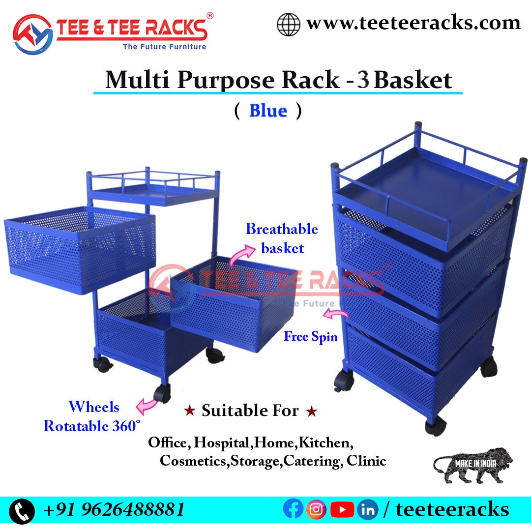 3 BASKET BLUE - TEE & TEE RACK® Multi Purpose Rotating Rack Trolley with Wheels, Portable Storage Rack for kitchen, Bathroom & Living Room, Fruits & Vegetable Container Basket Organizer Holder S