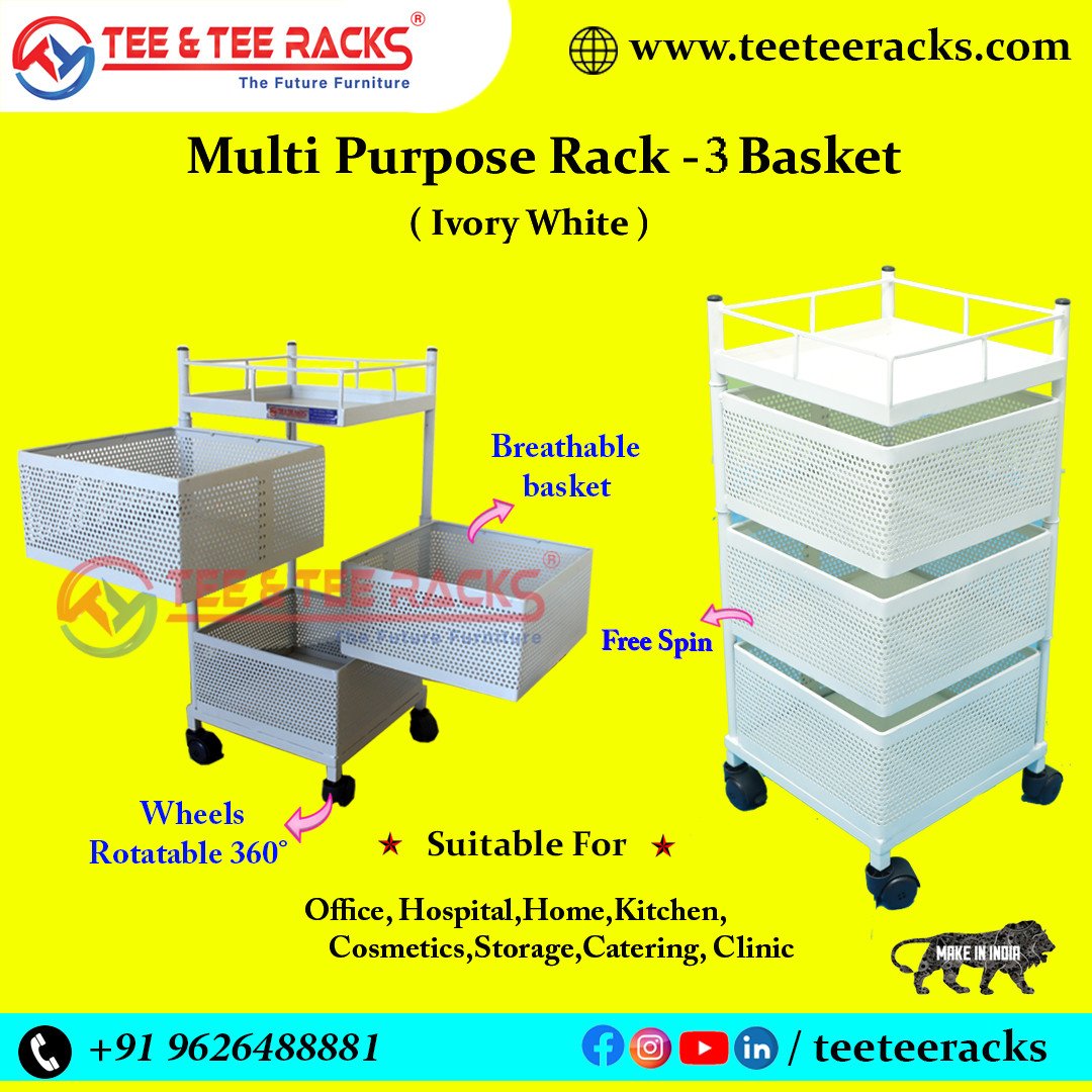 3 BASKET IVORY - TEE & TEE RACK® Multi Purpose Rotating Rack Trolley with Wheels, Portable Storage Rack for kitchen, Bathroom & Living Room, Fruits & Vegetable Container Basket Organizer Holder S